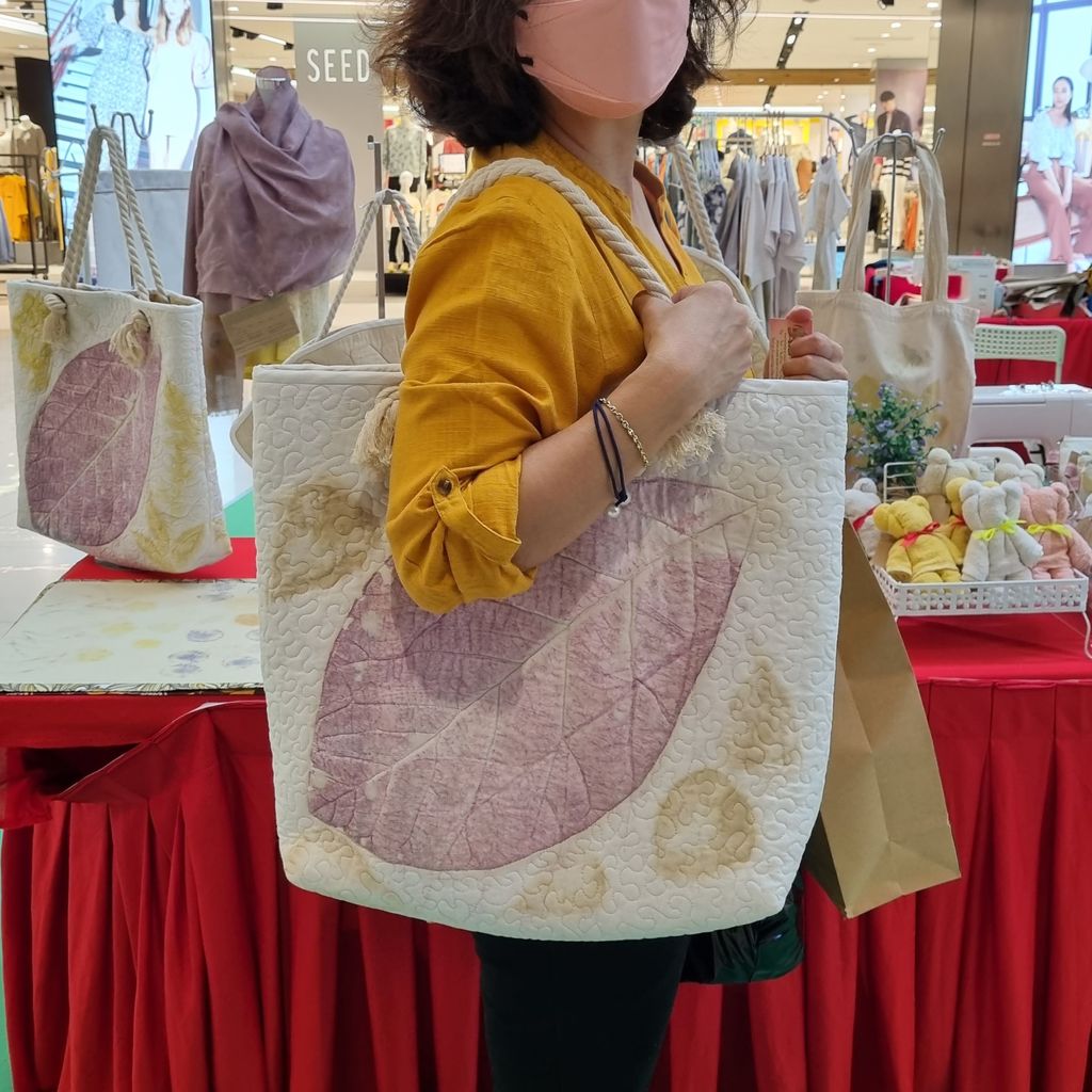 This is a very special eco print tote bag; a huge one! Only 1 piece per design. This tote bag can be used as a hand carry bag or a shoulder bag. The bag's body is crafted in detail using free hand quilting patterns. It comes with a zipper pocket and a double open pockets inside. The bag has a magnetic button as closure. Please refer to the pictures. This eco print bag is definitely a suitable gift for all ladies!